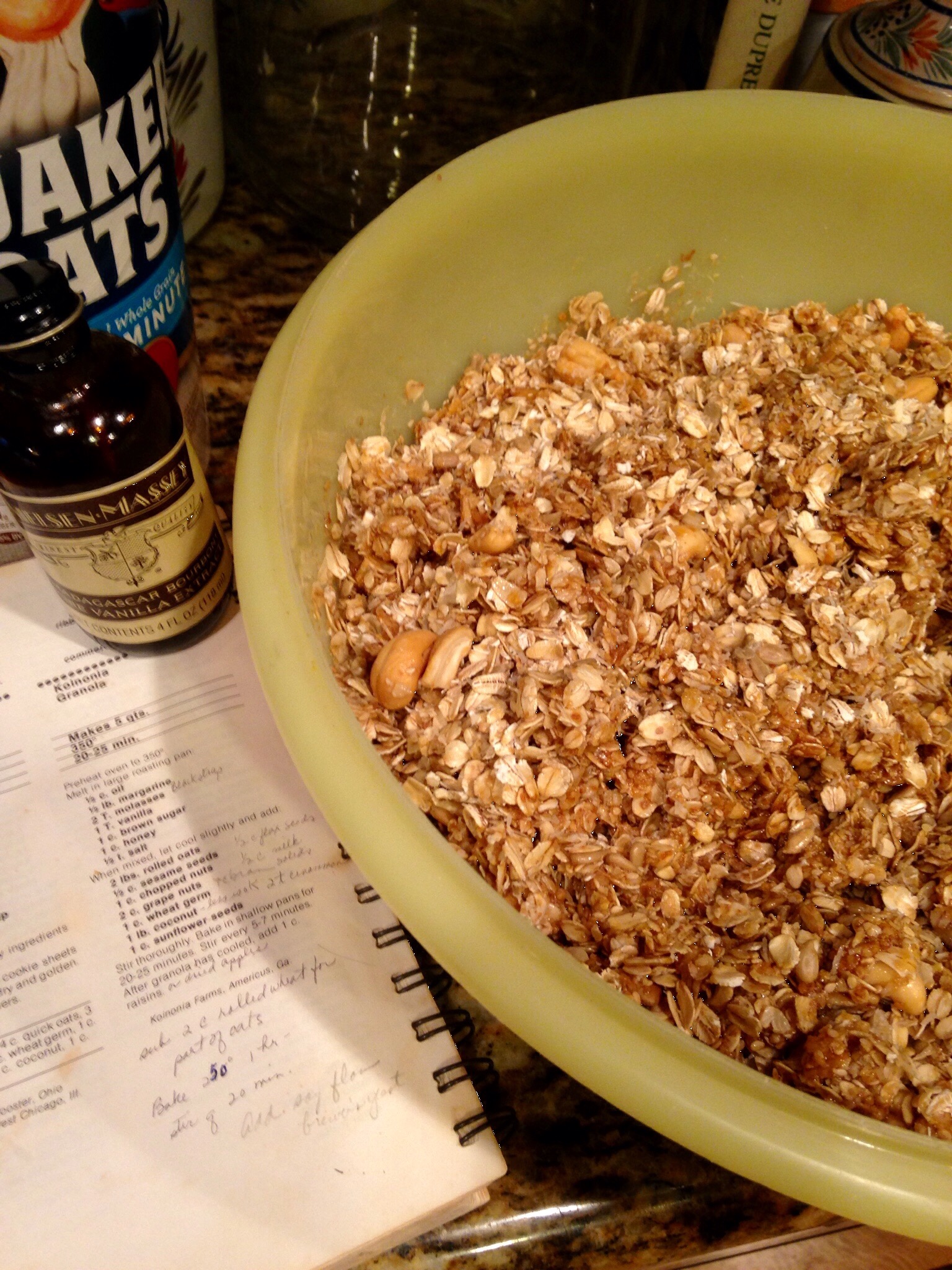 Then I baked it in three batches according to my revised instructions I wrote to myself. (250 degrees for 1 hour, stirring every 20 minutes) Clearly, I had burned some granola in my time. It came out great tonight!