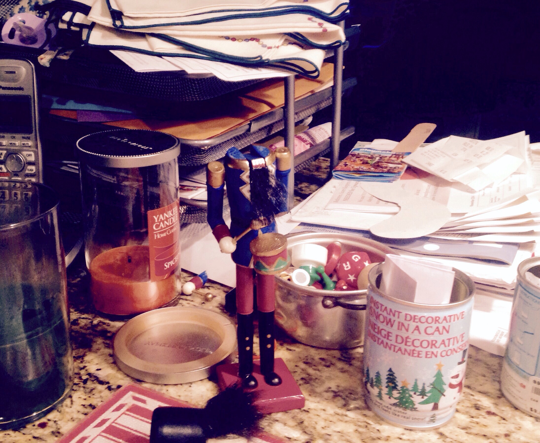 Crowding my coveted kitchen counter space are two seasonal candles, a headless nutcracker that needs mending, a doll’s dish full of random game pieces and dice, two cans of snow that we are afraid to reconstitute since a protective covering is mentioned in the instructions, a large stack of unopened mail and two small stocking gifts which did not find their way upstairs to be packed by my 10-year-old granddaughter.