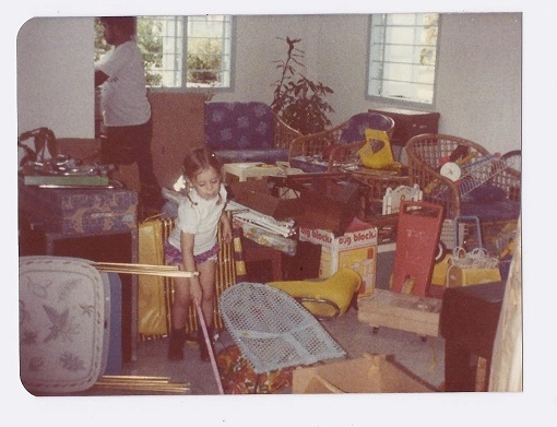 So this morning I am thinking of Aminah, my Malay amah (helper) in Singapore some years back, a wise woman in all ways. The summer we moved there with our 2, 4 and 6 year old children, our container arrived from the States about 8 weeks after we did. (How we survived the 8 weeks is another story.) The movers said they had to unpack everything themselves in order for any breakage to be covered by insurance. So all the contents of all the boxes: toys, dishes, kitchen stuff, clothes, books, bedding, everything we guessed we might need in our new life on the other side of the planet (and actually far more than we did need) was spread over every surface in my equatorial house. Even the mosquitoes and cicaks (geckos) were a bit intimidated. I actually wept it was so overwhelming. And amazingly, today I found this picture I took of one of the rooms. Four year old Allison was “helping”.